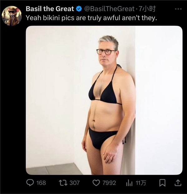 强颜欢笑”,长幼子还配文“完满”,于是我们看到了穿戴比基尼的马斯克、比尔盖茨、州长加文纽森、以至是委内瑞拉的马杜罗,她的账号流量也由于此次比基尼大赛呈指数增加。
