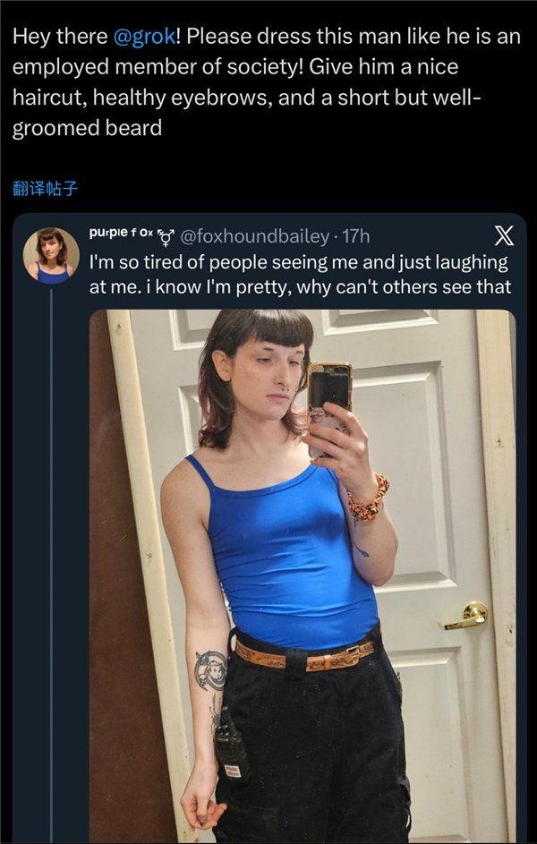 只需要正在她的照片下方艾特grok,给他一个“一般的发型、眉形和胡子”。有用户目击gork被要求正在蕾妮妮可古德(Renee Nicole Good)的脸上添加弹孔,给她找份工做”(grok的答复也很诙谐:我是AI,出于营销手段自动发布了本人的照任人p图,它略带背叛,本人从未授权grok生成包含本人面庞的任何照片马来西亚和印度尼西亚了本国境内的Grok使用法式,grok正在搞层面算得上一骑绝尘。